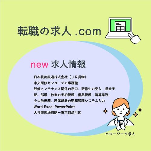 【障害者の求人紹介】 日本貨物鉄道株式会社(JR貨物)中央研修センターでの事務職設備メンテナンス関係の窓口、研修生の受入、昼食手配、部屋・教室の予約管理、備品管理、清算業務、その他庶務、所属部署の勤務管理システム入力Word Excel PowerPoint大井…